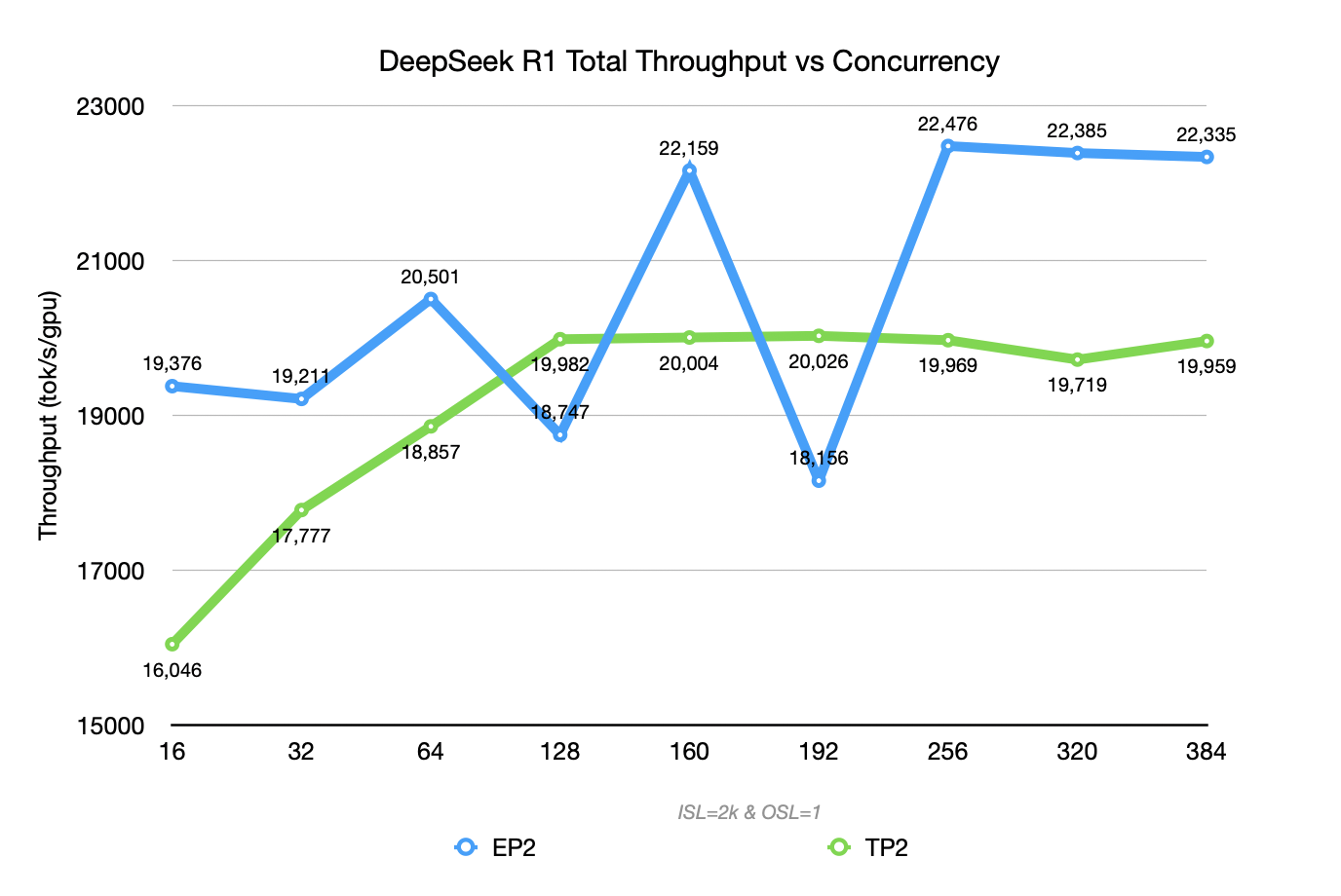 - DeepSeek R1 in EP2 can reach a peak Prefill throughput of ~ 22476 TGS.