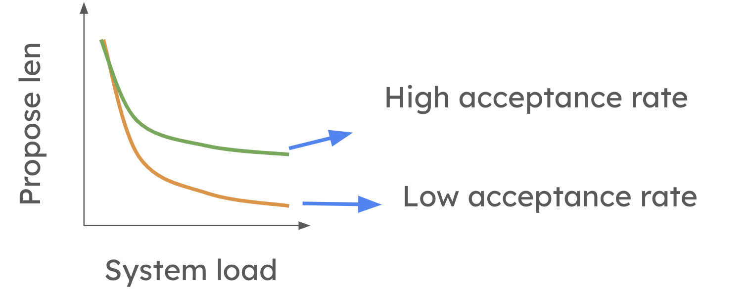 To overcome the limitations of speculative decoding in high-QPS settings, vLLM is working on implementing dynamic speculative decoding. Feel free to check out the paper for more detail. This is also one of the active research directions in vllm! This feature will allow vLLM to adjust the number of speculative tokens based on system load and the accuracy of the draft model. At a high level, dynamic speculative decoding shortens the proposed length when system load is high. However, the reduction is less pronounced when the average token acceptance rate is high as shown in the picture below.