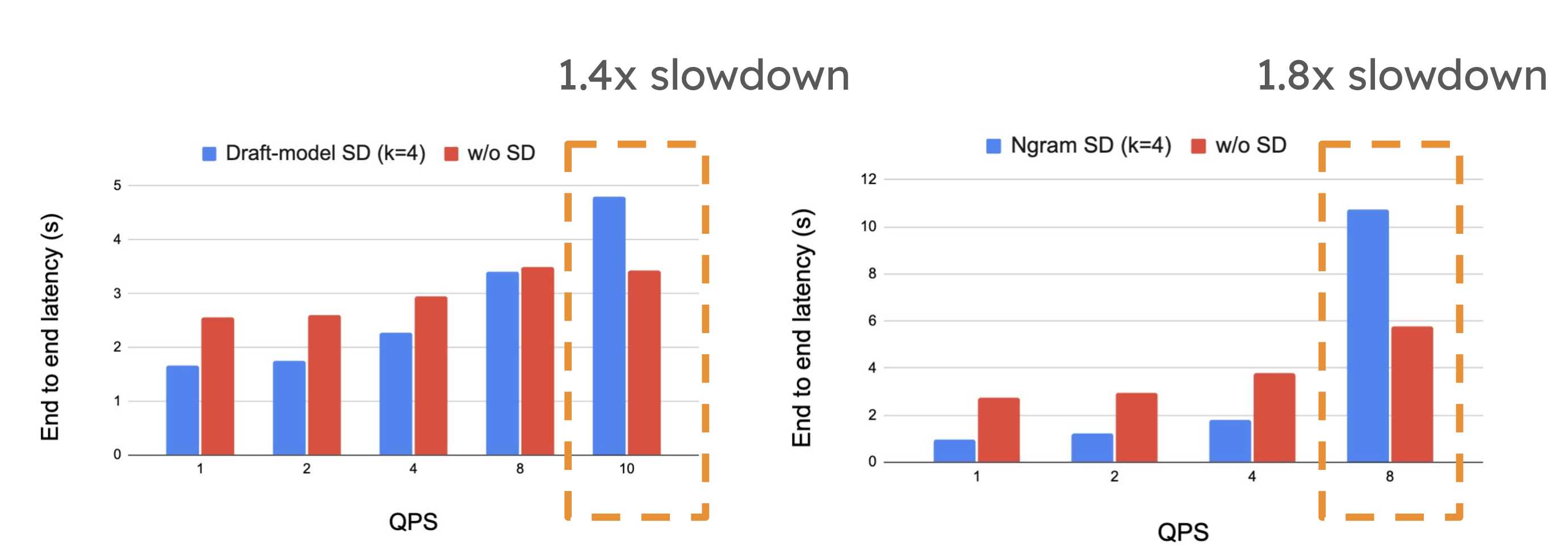 However, in high-QPS environments, speculative decoding may introduce performance trade-offs. The extra compute required to propose and verify tokens can sometimes slow down the system when it is already compute-bound, as seen when the number of requests per second increases. In such cases, the overhead of speculative decoding can outweigh its benefits, leading to reduced performance.